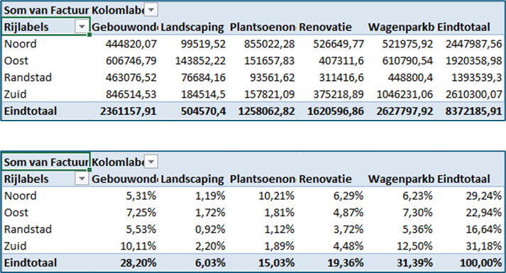 Draaitabellen zijn een krachtige functie in Excel, waarmee je snel grote hoeveelheden gegevens kunt samenvatten en analyseren. Met draaitabellen kun je gegevens groeperen, filteren en sorteren, en met een paar klikken aangepaste rapporten genereren. Dit kan je uren werk besparen en je helpen om snel inzicht te krijgen in je gegevens. Ter illustratie: in onderstaand voorbeeld is een bestand van 60.000 records gegroepeerd op vier regio’s en percentage van het eindtotaal.
