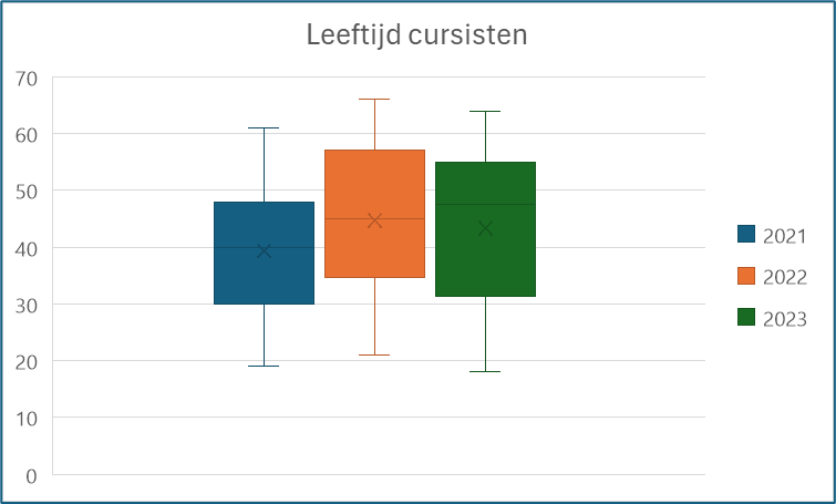 In 2023 valt het op dat de mediaan relatief hoog ligt. Dit betekent dat er in dat jaar veel oudere cursisten zijn. De leeftijd van de helft van de cursisten ligt immers boven de streep van de mediaan.