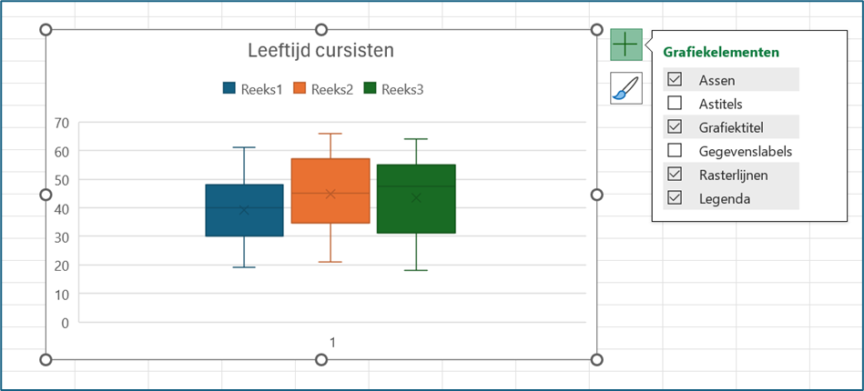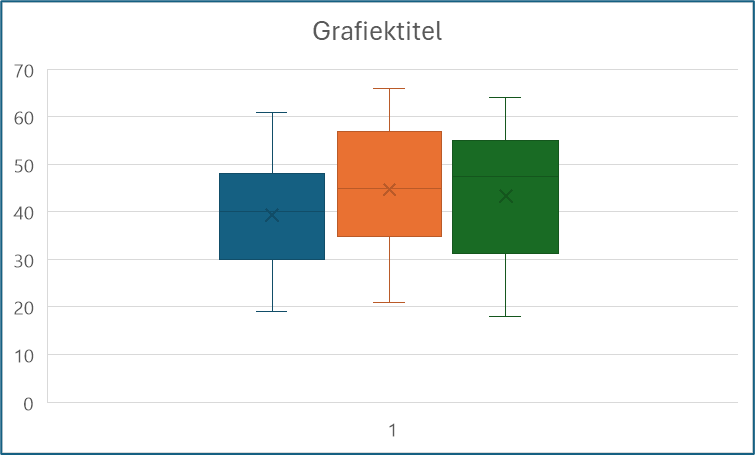 De drie boxen representeren ieder een jaartal. De uiteindes van de verticale lijnen geven de jongste en oudste cursisten weer, oftewel de minima en de maxima. Binnen het gekleurde vak liggen alle data tussen het eerste en derde kwartiel. De onderkant van het gekleurde vak is het eerste kwartiel, de bovenkant het derde kwartiel. Dit betekent dat 50% van de data in het gekleurde vak liggen.