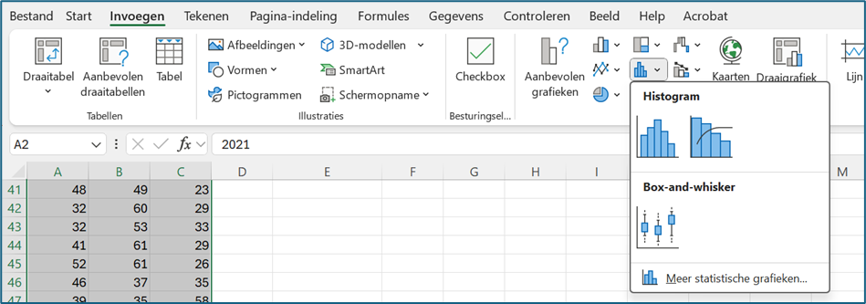 Om een Box- en Whisker-grafiek te plaatsen in Excel selecteer je allereerst alle gegevens die je wilt weergeven in de grafiek. Klik vervolgens op het tabblad Invoegen op Statistische grafiek invoegen. In het venster dat verschijnt, kun je kiezen voor Box-and-Whisker.