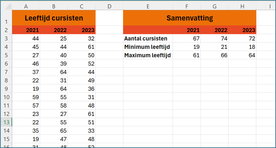 In deze blog laten wij zien hoe je in Excel een Box- en Whisker-grafiek maakt. Dat doen wij aan de hand van onderstaande gegevens. In deze dataset staan de leeftijden van cursisten per jaar. Onderstaande afbeelding toont een deel van de gegevens en een samenvatting van de gegevens.