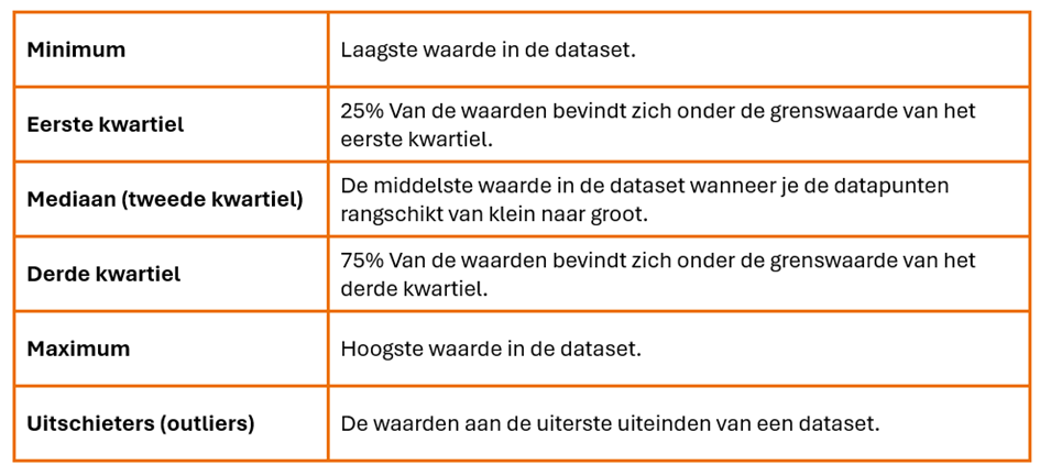 In een Box- en Whisker-grafiek worden vijf belangrijke beschrijvende statistieken weergegeven: het minimum, het eerste kwartiel, de mediaan, het derde kwartiel en het maximum. Daarnaast is het mogelijk om uitschieters (outliers) weer te geven in een boxplot. In onderstaand overzicht vind je een verduidelijking van de statistische begrippen:
